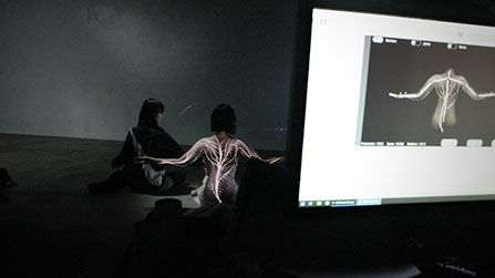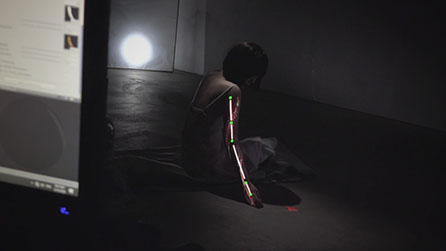 Projecting on a face or a bust requires precision, but the shape itself does not vary a lot. In our case, bones and muscles are moving freely. By using an infrared camera, the system tracks multiple reflective markers placed on the skin. They guide the real-time deformation of a CG model and make it fit the shape of the body.